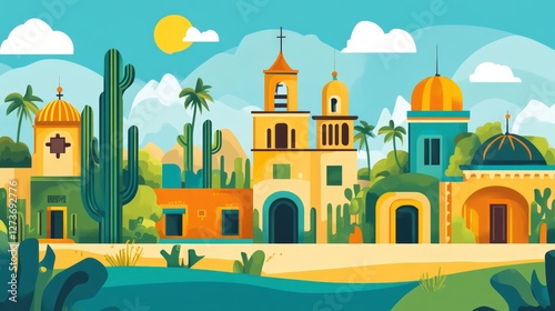 town, desert, cactus, building, landscape, travel, architecture, tour tourism, sky, summer, sunny, day, illustration, colourful, vibrant, palm, tree, mountain, art, graphic, design, culture, mexican, dome, vacation, holiday, landmark, nature, scenic, southwest, west, yellow, blue, green, orange, flat, style, cartoon, bright