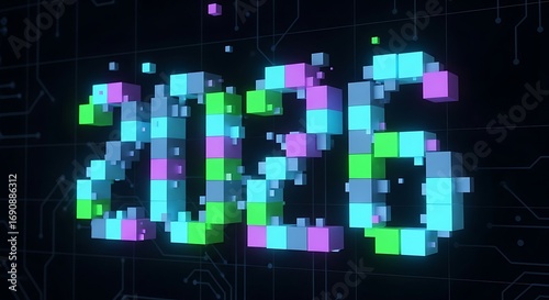 Vibrant digital 2020 formed from glowing colorful cubes against futuristic circuit board backdrop