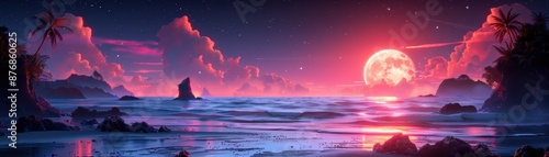 Vibrant digital artwork of an otherworldly beach scene with a large pink moon illuminating the night sky and reflecting on the ocean water.