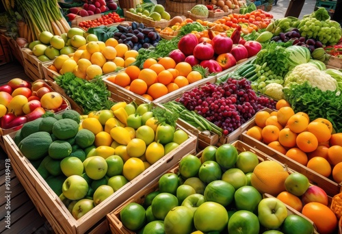 vibrant display colorful fresh fruits vegetables arranged beautiful market setting bright colors natural textures, organic, healthy, produce, arrangement