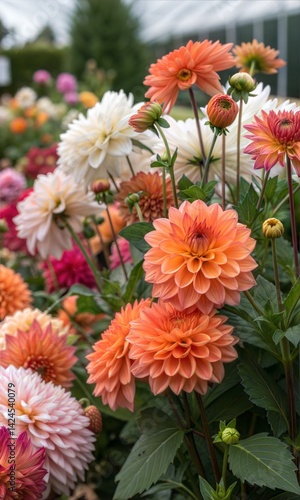 Vibrant display of assorted dahlias in full bloom with orange, pink, and white hues (Bouquet)