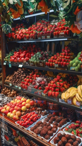 Vibrant display of fresh fruits and vegetables in a market setting, showcasing a variety of colorful, healthy, and nutritious produce.