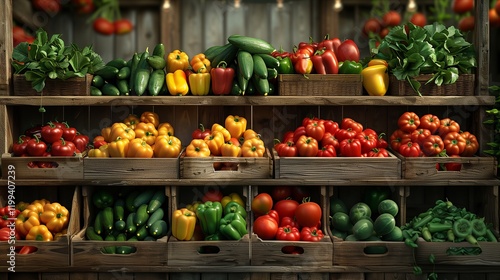 Vibrant display of fresh vegetables in wooden crates at a market, showcasing nature's rich colors and variety.