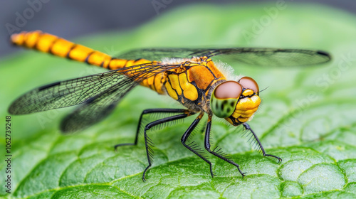 vibrant dragonfly perched on lush green leaf, showcasing its striking yellow and black patterns. intricate details of its wings and eyes highlight beauty of nature