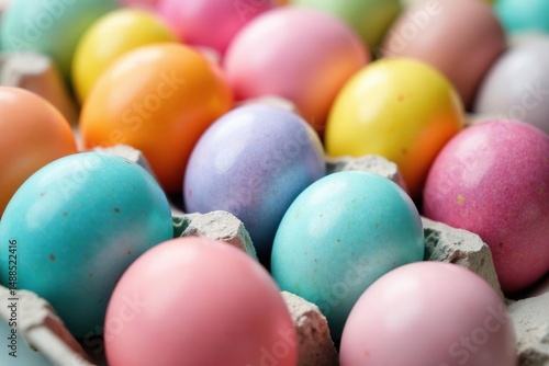 Vibrant dyed eggs in pastel shades, speckled and solid colors , symbol, candy, basket