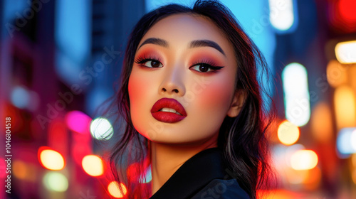 evening, portrait, stylish, make-up, urban, vibrant, city landscape, bold, night, light, bokeh, fashion, beauty, glamour, artistic, person, expression, trend, colourful, modern, chic, nightlife, street, allure, elegance, high-coloured, face, lip, eye, charismatic, contemporary, cosmetic, street light, coiffure, confident, downtown, dynamic, aesthetic, neon, lively, attitude, atmosphere, metropolis, enchanting, dramatic, night time, captivating