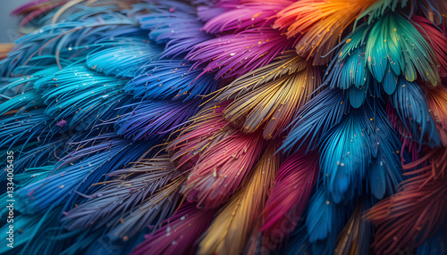 Vibrant Feather Symphony: A close-up shot of a stunning array of brightly colored feathers, each showcasing intricate details and textures, creating a captivating visual spectacle.