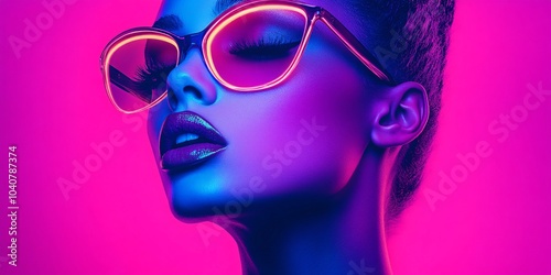 fashion, people, person, female, woman, girl, beauty, lady, model, style, beautiful, neon, goggles, vibrant, sunglasses, art, photo, purple, background, confident, pose, glam, colourful, bright, electric, futuristic, aesthetic, purple background, fashion model, color palette, neon light, night photography, soft focus, high contrast, eye makeup