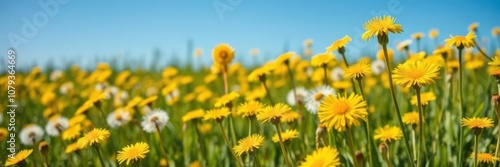 Vibrant field of dandelions under a clear blue sky, summertime, sunny