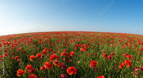 Vibrant field of red poppies under a clear blue sky, showcasing nature's beauty