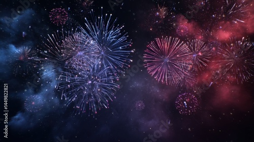 Vibrant fireworks explode in a night sky, painting the darkness with bursts of purple, blue, and red.