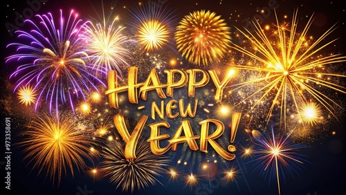 Vibrant fireworks explode in a nighttime sky behind bold, golden typography wishing a joyful and prosperous start to the new year.