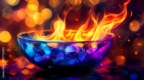 Vibrant flames dance in a sparkly, blue and purple bowl, set against a backdrop of bokeh lights in warm yellow and orange tones. the bowl's. Iridescent Flames. Illustration