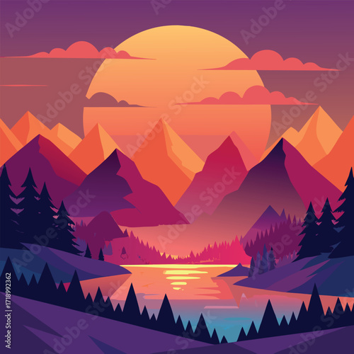 mountain, landscape, illustration, vibrant, colourful, nature, outdoors, scenic, peak, summit, adventure, travel, hiking, camping, digital artwork, graphic design, background, icon, minimalist, modern, geometric, sky, tree, vale, outdoor recreation, serene