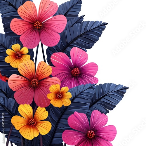 flower, floral, tropical, leaf, arrangement, bouquet, pink, yellow, orange, purple, blue, green, vibrant, colourful, exotic, nature, blossom, bloom, botanical, plant, design, illustration, graphic, background, wallpaper, pattern, texture, summer, spring, beauty, elegance, decoration, wedding, celebration, gift, greeting card, invitation, art, abstract, digital artwork