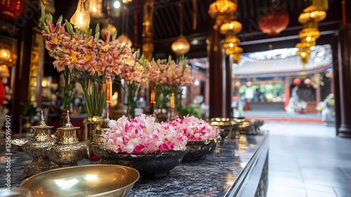 Vibrant floral arrangements and traditional decor create a stunning atmosphere in a cultural setting : Generative AI