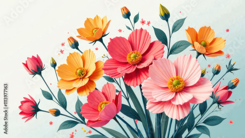 floral, bouquet, vibrant, pink, orange, blossom, flower, bloom, flower petals, foliage, nature, garden, arrangement, colourful, design, botany, art, leaf, beauty, decor, bright, fresh, high-coloured, plant, organic, spring, elegant, decorative, style, pattern, artistic, greenery, natural, blooming, ornament, cheerful, lush, handcraft, aesthetic, flora, composition, harmonious, radiant