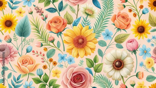 Vibrant Floral Composition A Seamless Pattern of Sunflowers, Roses, and Delicate Blossoms on a Soft Background