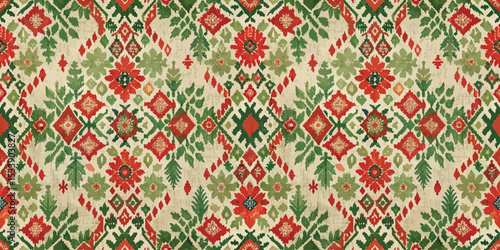 Vibrant floral pattern featuring red and green hues on a beige background.