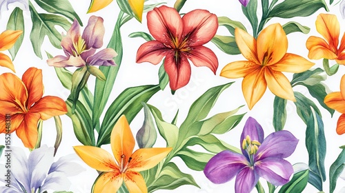 floral pattern, lily, vivid colors, green leaf, watercolor, nature, spring flower, illustration, colorful flowers, floral arrangement, garden, vibrant, textile design, wallpaper, greeting card, spring, colourful, fresh, hand-painted, natural beauty, aesthetic, detailed, bright, enticing, composition, design, artwork, elegant