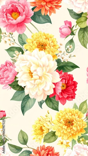 Vibrant floral pattern with dahlias and roses