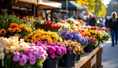 flower, colourful, market, display, vibrant, bouquet, tulip, sunflower, geranium, flower petals, pot, black, wooden, autumn, people, blurred, background, stall, sunlight, warm, fall, seasonal, nature, beauty, blossom, blooming, fresh, gardening, plant, row, variety, colours, garden, shop, seller, client, freshness, floristry, floral, arrangement