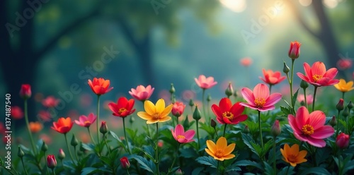 Vibrant flowers against misty backdrop creating drama and beauty, vibrant, misty