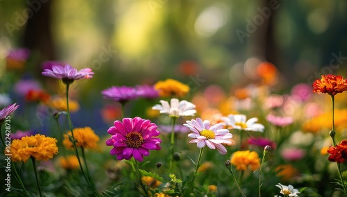 flower, garden, nature, colourful, blooming, summer, spring, beauty, vibrant, blossom, flower petals, sunlight, bright, pink, purple, orange, yellow, red, white, green, lush, detailed, close, sharpened, soft, blurred, background, outdoors, natural, daisy, zinnia, marigold, flora, plant, growing, foliage, warm, daylight, sunlit, meadow, pretty