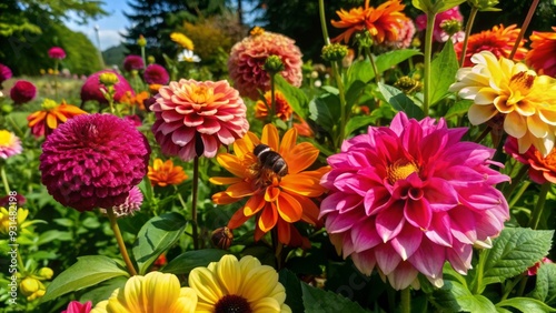 Vibrant flowers in shades of pink, orange, and yellow bloom in a lush backyard garden, attracting busy bees and butterflies to this thriving pollinator oasis.