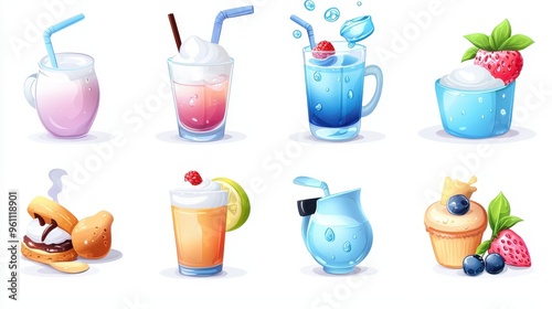 Vibrant Food and Drink Icons Enhanced with Realistic Water Droplets and Steam Effects for Freshness Concept.