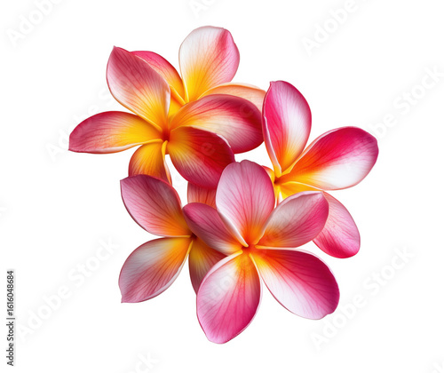 Vibrant frangipani flowers in full bloom against a deep transparent background