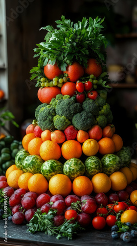 fresh, produce, fruit, vegetable, pyramid, stack, arrangement, colourful, vibrant, healthy, food, organic, market, harvest, abundance, bounty, green, red, orange, purple, broccoli, tomatoes, grape, orange, strawberry, plum, blueberry, parsley, nourishment, natural, display, grocery, raw, diet, vegan, vegetarian, farm, wholesome, assortment, collection, variety, conical, piled, delicious, ingredient, bright, edible, garden, rustic