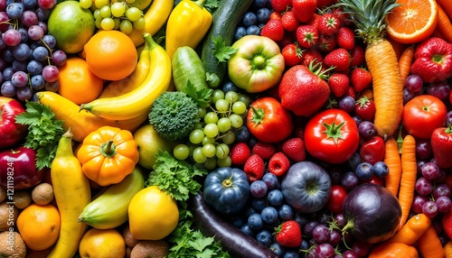 fruit, vegetable, produce, abundance, still life, colourful, vibrant, healthy, appetising, fresh, juicy, crisp, red, orange, yellow, green, purple, blue, berry, banana, grape, tomatoes, carrot, pineapple, lemon, lime, broccoli, epicure, market, organic, natural, farm, food, photo, composition, texture, colours, variety, delicious, nourishment, lifestyle, diet, grocery, supermarket
