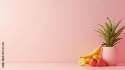 Vibrant fruit arrangement with a tropical plant minimalist setting still life composition bright environment close-up view healthy lifestyle concept