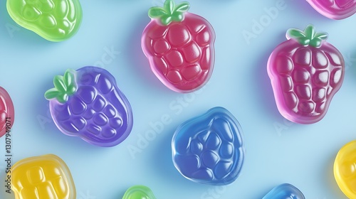Vibrant Fruit Gummies in Different Shapes and Colors on Light Blue Surface for Sweet Enjoyment : Generative AI