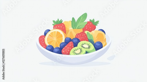 Vibrant fruit salad with strawberries, blueberries, kiwi, and oranges on a white plate, garnished with fresh mint leaves