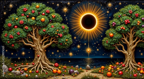 Vibrant fruit trees under a solar eclipse set against a starry night sky