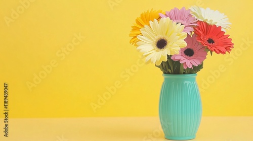Vibrant Gerbera Daisies in Teal Vase Yellow Background