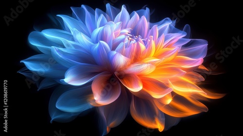 Vibrant Glowing Dahlia Flower Abstract Floral Art Blue Orange Hues Dark Background