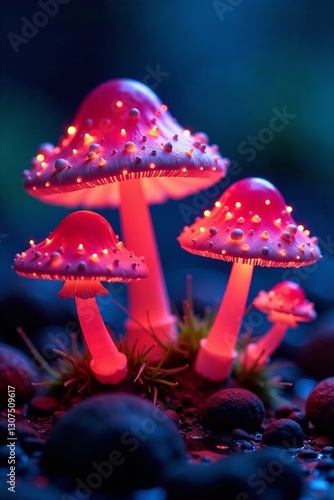 Vibrant glowing mushrooms illuminated in a mystical forest setting under dim light.