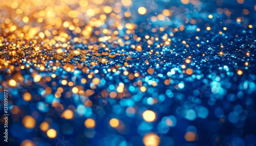 Vibrant golden and blue glitter particles reflecting light, generating sparkling bokeh effect symbolizing festive celebration, festivity, and glamorous event backdrop