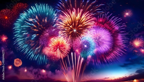vibrant, night sky, bright, festive, celebration, brilliant, pyrotechnic, glowing, sparkling, aglow, celebratory, radiant, fireworks, night, explosion, holiday, festival, party, colourful, blue, burst, year, new, light