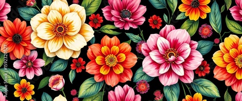 pattern, flower, background, floral, summer, style, vivid colors, vibrant, art, decoration, bold, trendy, seamless, spring, print, design, wallpaper, bright, bloom, painting, gouache, whimsical, repeat, abstract, artistic, colourful, illustration, element, design element, creative, hand-painted, happy, hand-drawn, botanical, fabric, texture, textile, modern, surface