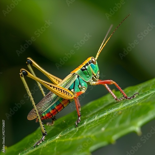 Vibrant Grasshopper Perched on Bright Green Leaf with Detailed Anatomy Visible in Close Up Nature Photography