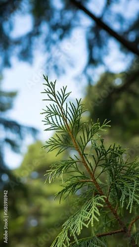 Vibrant green cedar branch with soft bokeh background, nature's detailed beauty