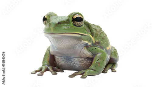 Vibrant green frog, an alert amphibian from natural ecosystems, captured in a detailed studio portrait on a clean white background, highlighting its unique skin and bright eyes