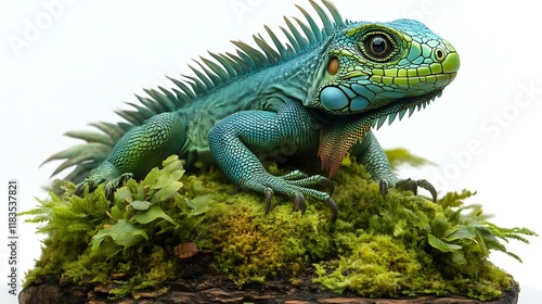 iguana, reptile, lizzard, green, moss, realistic, artistic, wildlife, nature, tropical, high-coloured, bright, scale, texture, detail, artwork, display, model, sculpture, figurine, fauna, exotic, colours, habitat, environment, botanical, plant, terrarium, collection, decorative, ornate, premium, luxury, hand-made, unique, masterpiece, vibrant, beauty, serene, tranquil, art, animal, reptilian