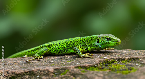 Vibrant green lizard resting on a textured log with blurred green background, close-up of a colorful reptile, detailed scales, wildlife photography