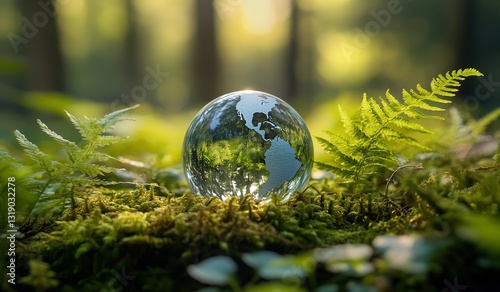 Vibrant green moss-covered forest with glass globe resting on ferns, Earth Day concept of environmental conservation and climate awareness. Futuristic ecology theme with scientific visualization eleme