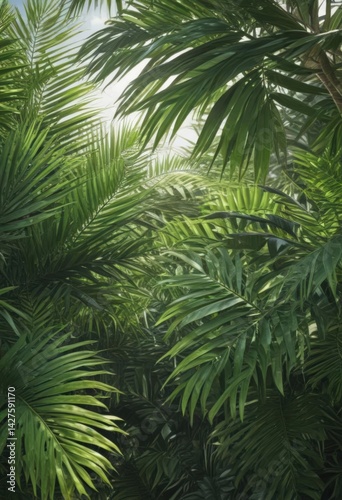 Vibrant green palm leaves, sunlight dappled, lush texture , green, background, jungle